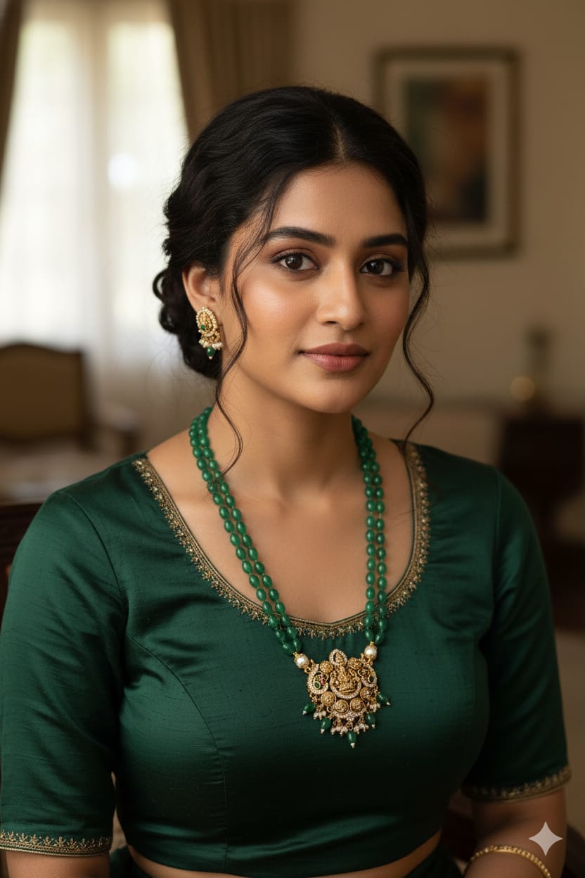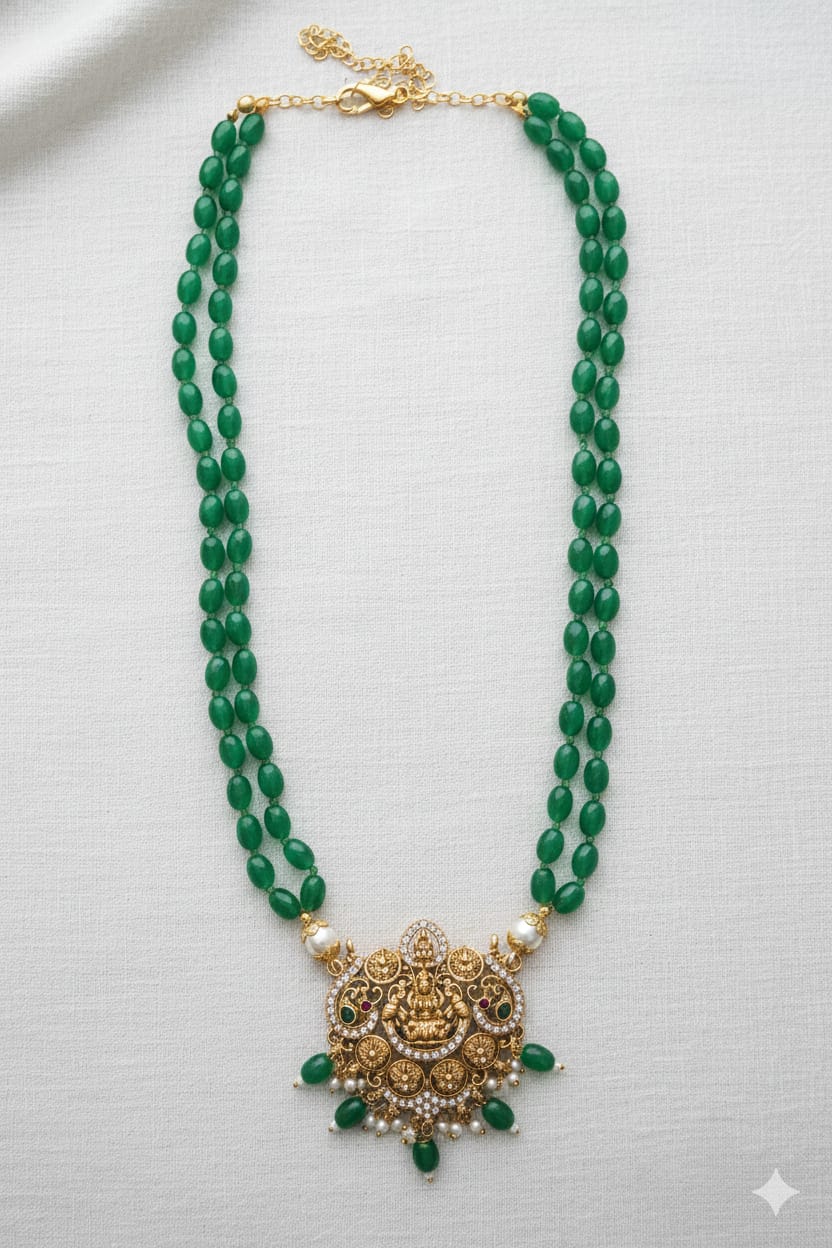 Bring home divine elegance with this beautifully crafted Green Beaded Lakshmi Temple Necklace. Designed with rich green oval beads and an intricately detailed Goddess Lakshmi pendant, this necklace reflects classic South Indian temple jewellery artistry.